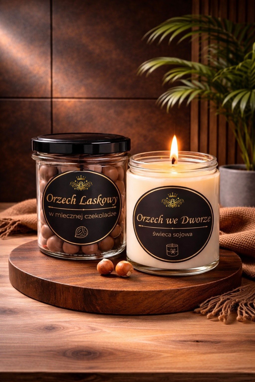 Świeca wykonana jest z naturalnego wosku roślinnego, dzięki czemu pali się czysto, długo i równomiernie, uwalniając głęboki, otulający zapach prażonych orzechów i subtelnej słodyczy. To kompozycja, która wprowadza do wnętrza spokój, ciepło i nutę luksusu. Z kolei orzechy laskowe w mlecznej czekoladzie to klasyczna, ponadczasowa słodycz — chrupiące, aromatyczne i oblane aksamitną czekoladą, idealne do kawy, filmu lub jako drobna przyjemność w ciągu dnia.