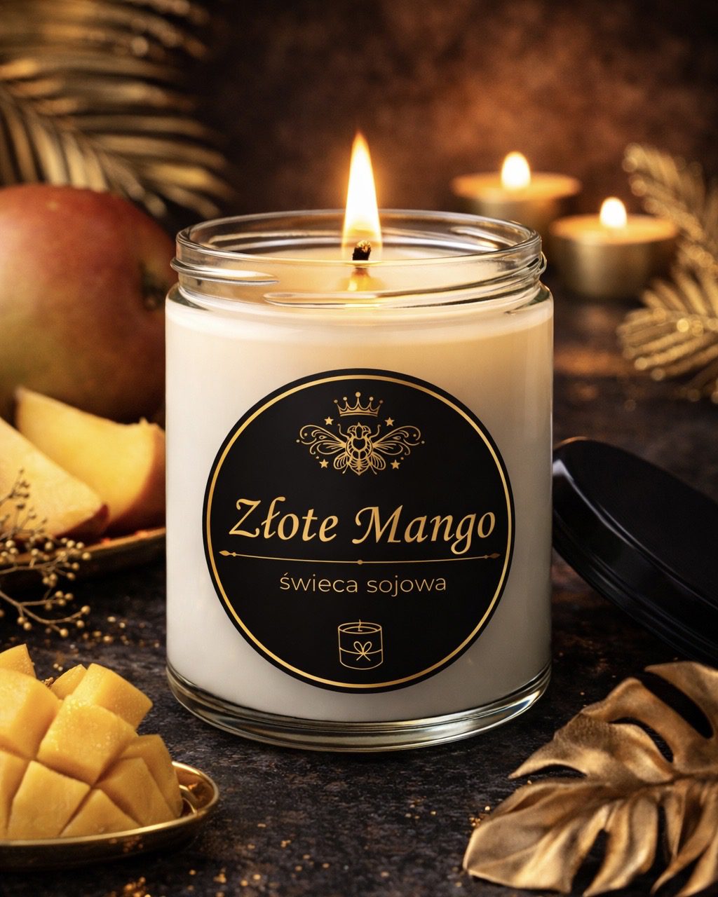 • Świeca sojowa „Złote Mango” (300 ml) – Naturalna świeca z wosku sojowego o soczystym aromacie dojrzałego mango, wzbogaconym subtelną zieloną nutą figowych listków. Zapach jest świeży, słoneczny i jednocześnie elegancki — łączy egzotyczną słodycz z delikatną roślinną lekkością. Wprowadza do wnętrza atmosferę relaksu, ciepła i wakacyjnej harmonii.